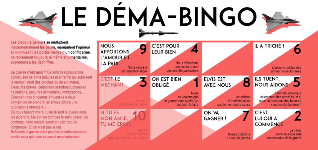 C’est pourquoi nous proposons un kit de résistance anti guerre : un tract en forme de jeu pour apprendre a débusquer les appels à la guerre partout où ils se cachent et une soirée-animation-débat autour de la déconstruction des discours martiaux.